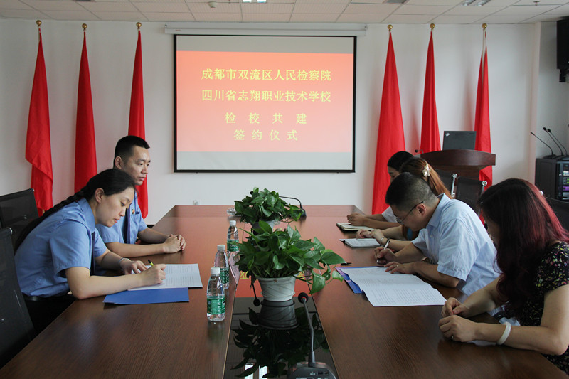 7月7日,我校校长张涛与双流区人民检察院副检察长李雯在学校会议室签订了《成都市双流区人民检察院 四川省志翔职业技术学校检校共建协议书》。根据《协议》,双流区人民检察院利用专项教育、预防宣传、以案说法等多种方式,在我校积极开展法制宣传,廉洁提醒等活动,双方开展学习交流,相互熟悉工作流程和内容,并为深入开展“校检共建”提供专业知识支撑。