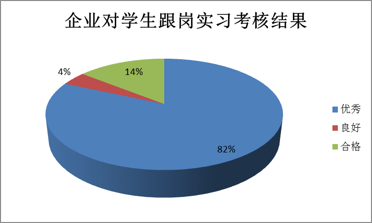 学生主要在校外实训基地实习,生均认识实习时长为5天,生均跟岗实习时间为30天,生均顶岗实习时间为240天,学生跟岗实习对口率为100%,学生顶岗实习对口率为90%,企业对我校学生跟岗实习考核优秀比例为82%,良好比例为4%,合格比例为14%,合作企业接受学生就业的比例为70%。