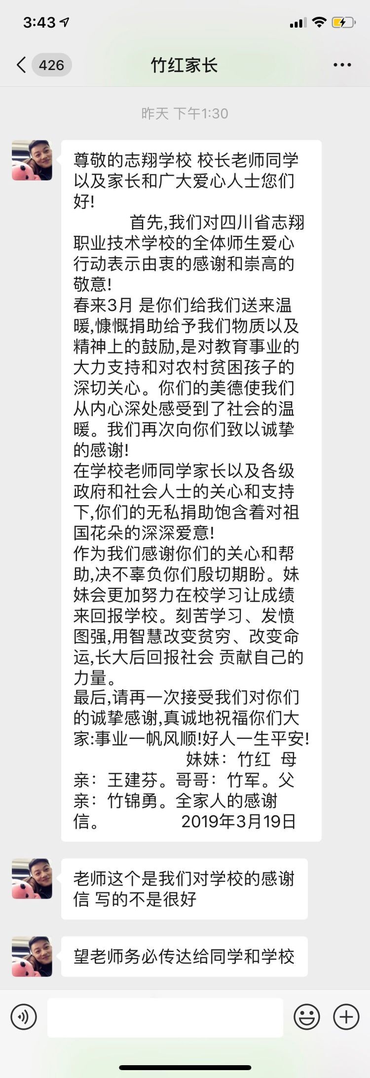 “尊敬的志翔学校,校长老师同学们以及家长和广大爱心人士您们好!首先,我们对四川省志翔职业技术学校的全体师生表示由衷的感谢和崇高的敬意!……”