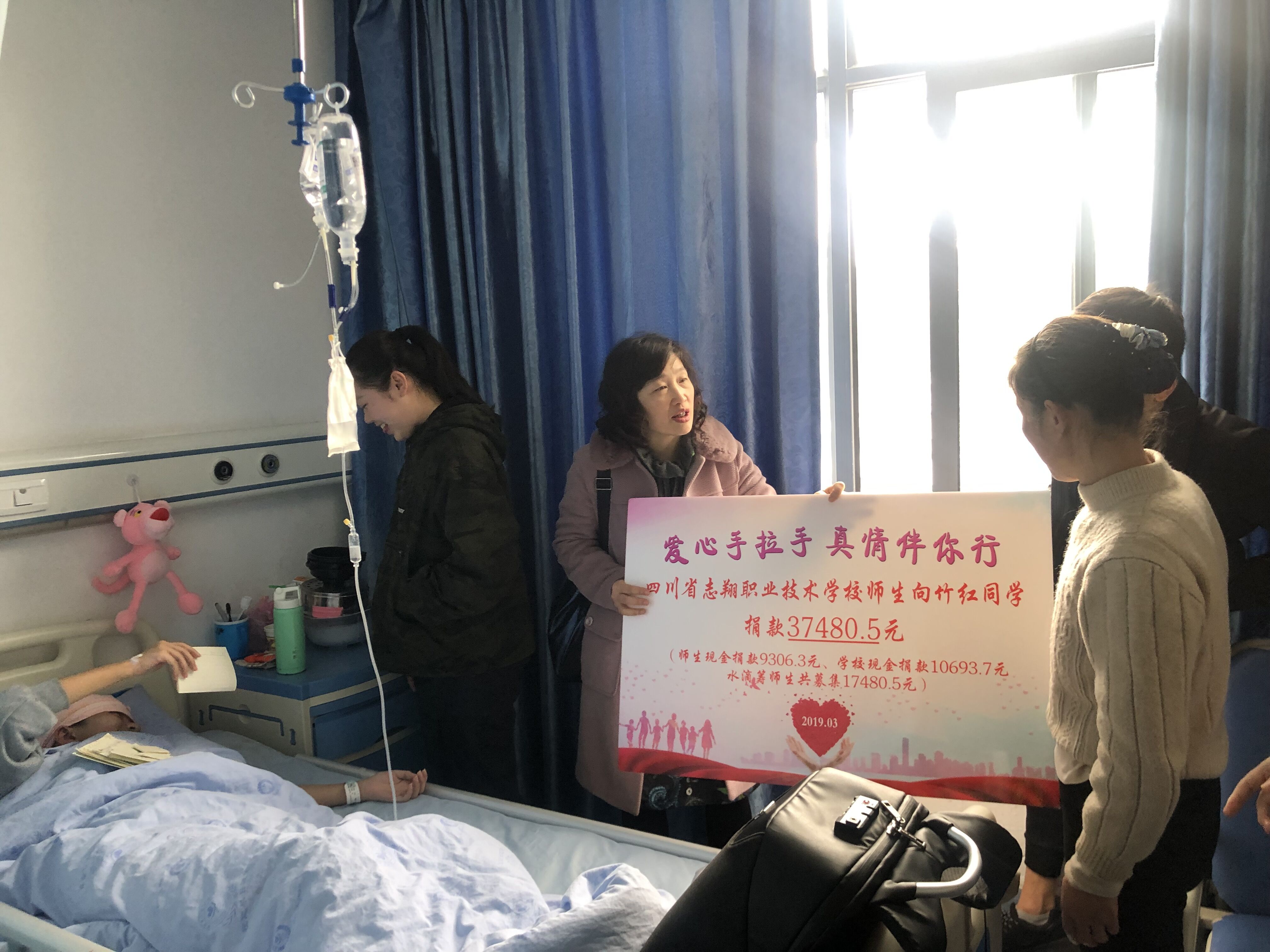 寒假期间,18902班竹红同学在雅安市芦山县因一场车祸导致重度昏迷,紧急入院抢救。学校得知这一情况后,高度重视,第一时间与竹红家长取得联系,了解学生伤情,安抚家长情绪,并积极与保险公司沟通,尽最大努力为学生提供帮助。同时,在学校发起爱心募捐活动,共募得爱心款37480.5元。