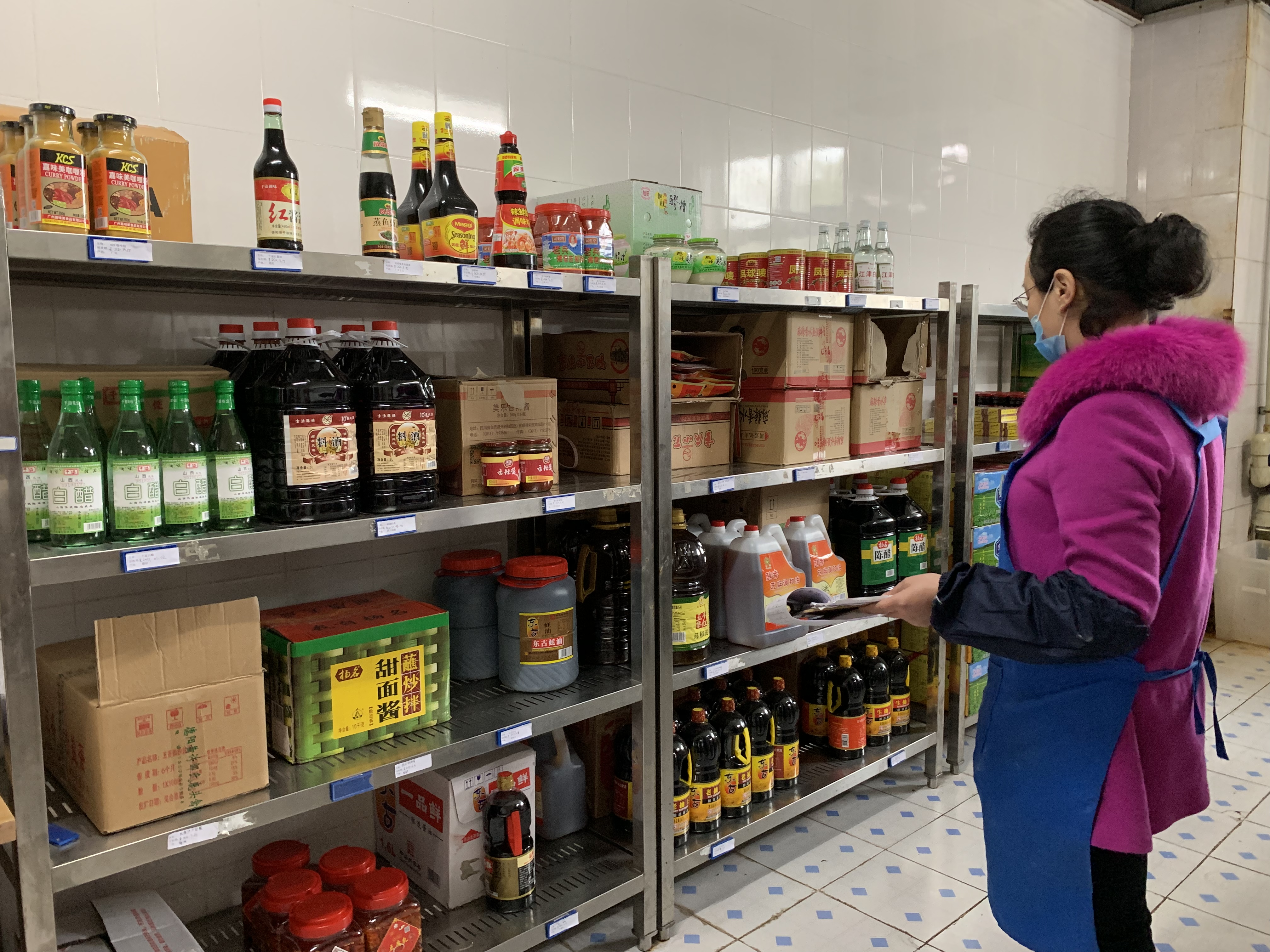 在材料间,新鲜的蔬菜、肉类等食材琳琅满目,食堂工作人员正在摘菜、切肉、清洗。作料间,油盐酱醋整整齐齐,摆放有序。采购清单、质检报告一应俱全。