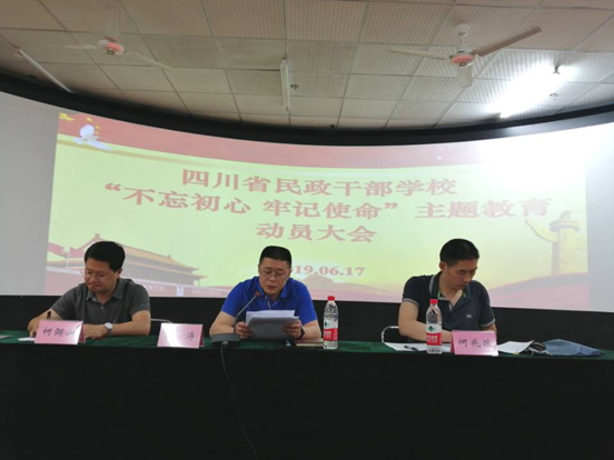 会上,四川省民政干部学校党总支书记、校长张涛强调,学校要认真贯彻中共中央及省委关于开展“不忘初心、牢记使命”主题教育的意见,要吃透精神、统一认识,以坚定的思想自觉、政治自觉、行动自觉开展好主题教育。