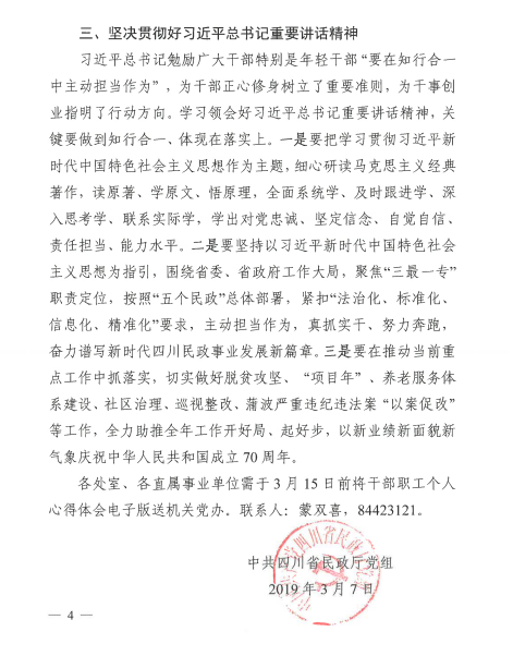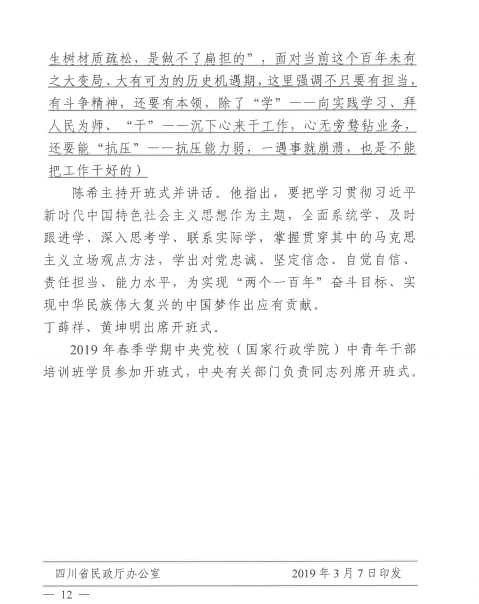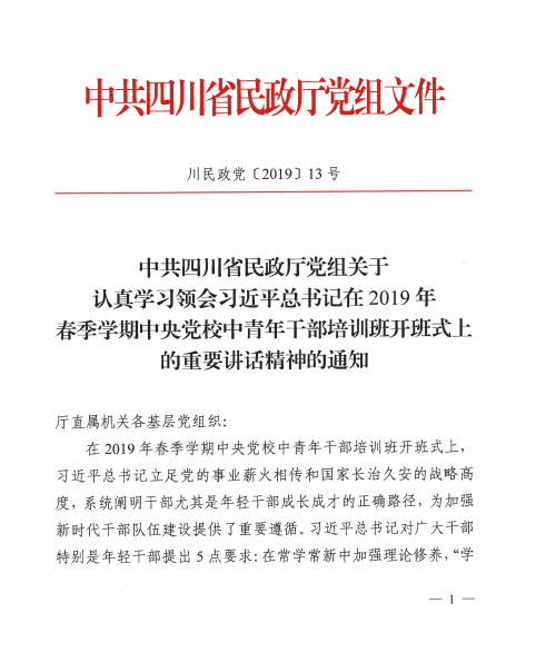 中共四川省民政厅党组关于认真学习领会习近平总书记在2019年春季学期中央党校中青年干部培训开班式上的重要讲话精神的通知