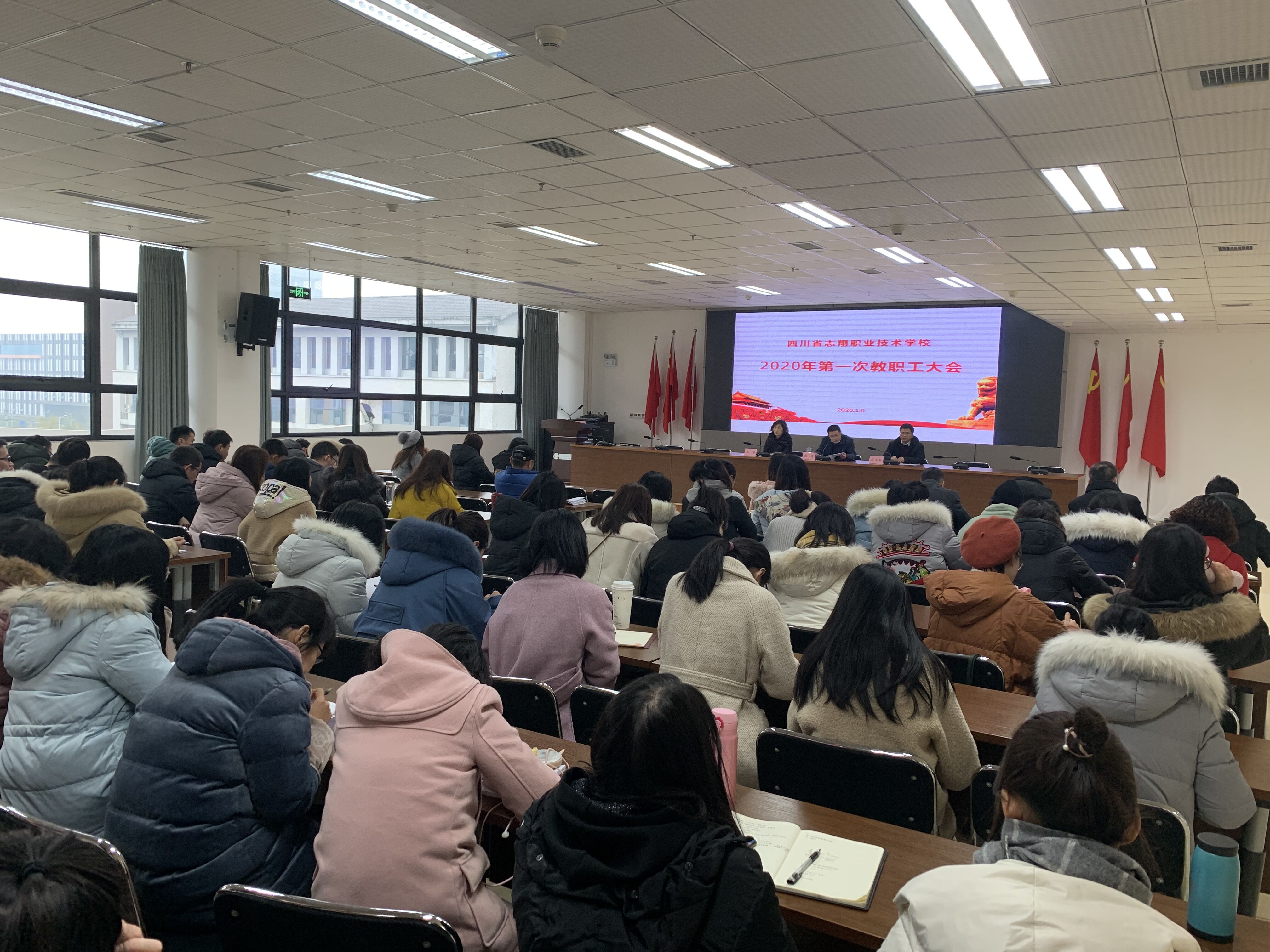 1月9日下午,我校在图书馆大会议室召开2020年第一次全校教职员工大会。校长张涛、校长助理范云松、杨涛及全体教职员工参加会议。
