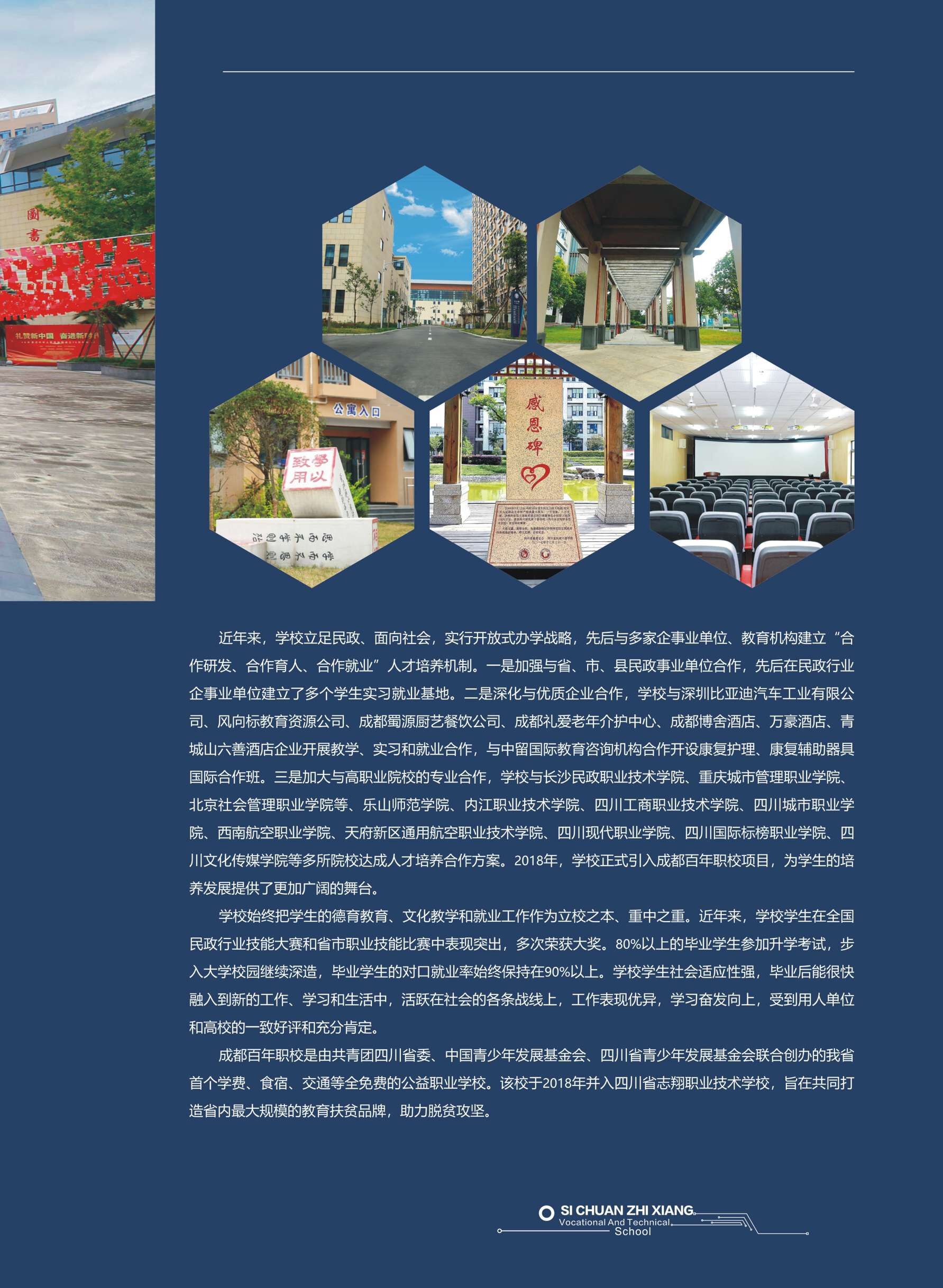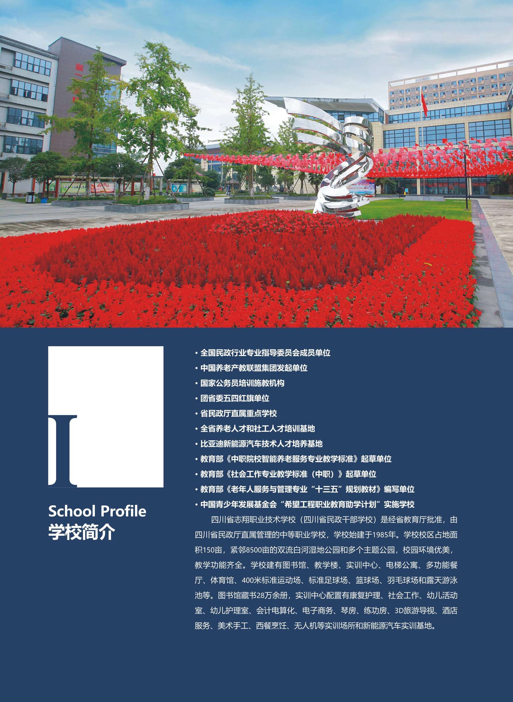 四川省志翔职业技术学校(四川省民政干部学校)是经四川省教育厅批准,由四川省民政厅直属管理的国家公办中等职业学校,学校于1986年建校。2008年,正式挂牌成立四川省志翔职业技术学校。