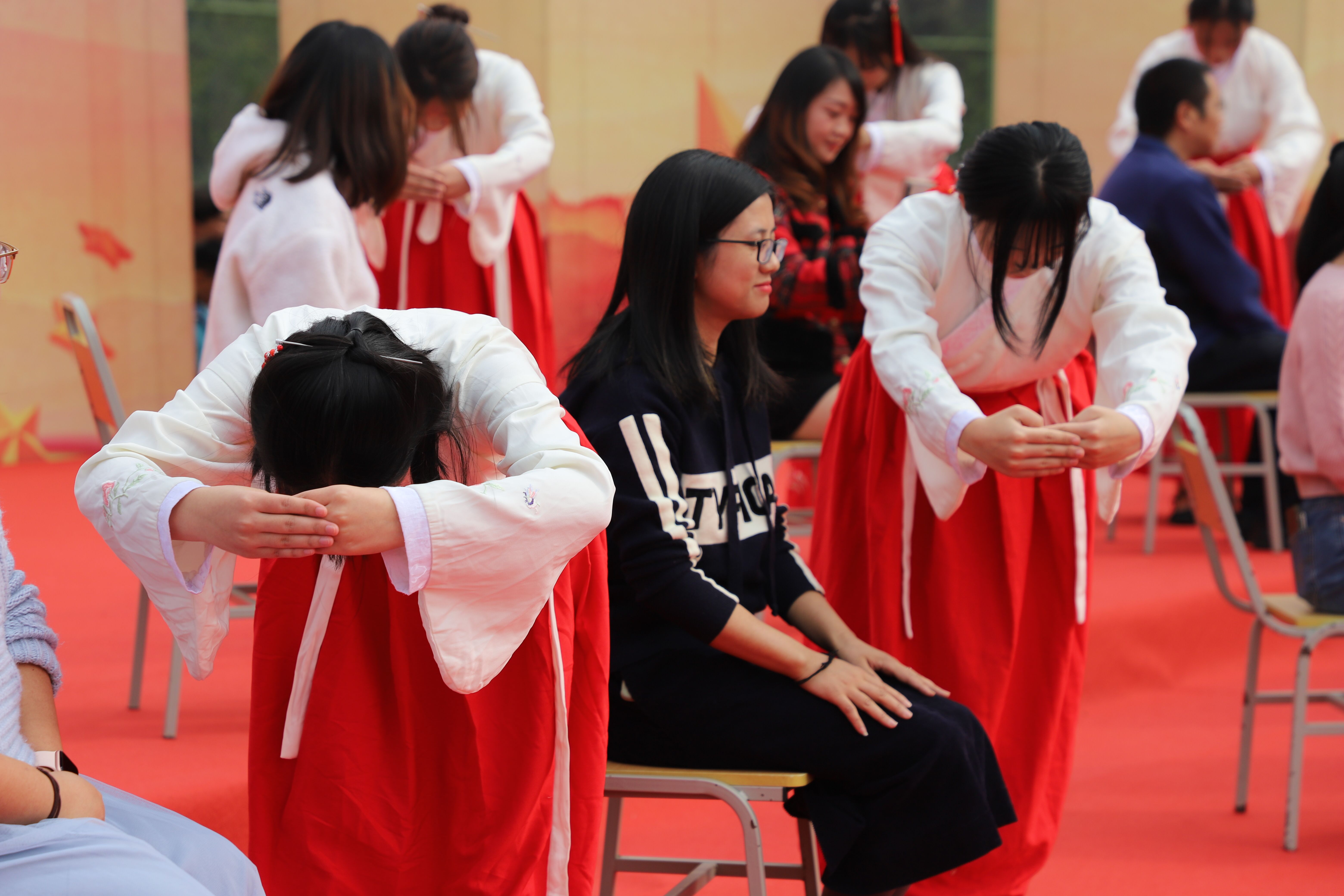 随后,同学们身着汉服双手作揖,充满着浓浓传统文化气息的“加冠礼”掀起活动的高潮。老师代表为参礼学生加冠及笄并将《中华人民共和国宪法》交到大家手中,嘱托大家做知法、懂法、守法的好公民。学生也面向父母行揖礼、敬孝茶,感谢父母的辛苦付出和养育之恩。校团委副书记漆晨曦同学作为学生代表分享了自己的感言。他讲到成人在即,同学们应该要学会感恩、学会担当,树立远大理想,用激情和梦想亮丽青春的风采,用智慧与汗水铸就人生的辉煌。