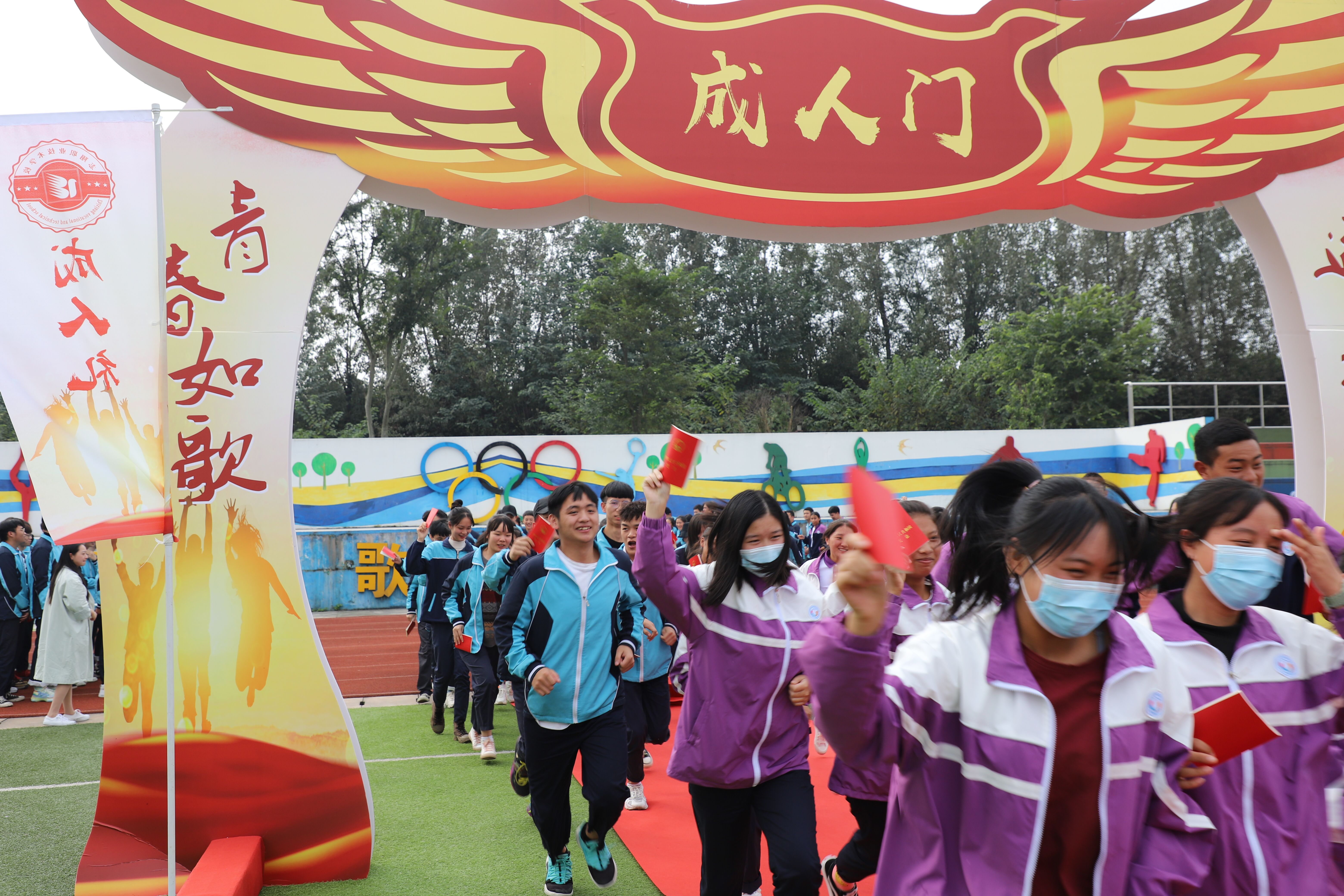 加冠礼成后,全体参礼学生面向国旗进行庄严宣誓,立志做有理想、有本领、有担当的好青年,努力成为中国特色社会主义合格建设者和可靠接班人。宣誓完毕,同学们大步奔向成人门,从此踏上人生新的征途。