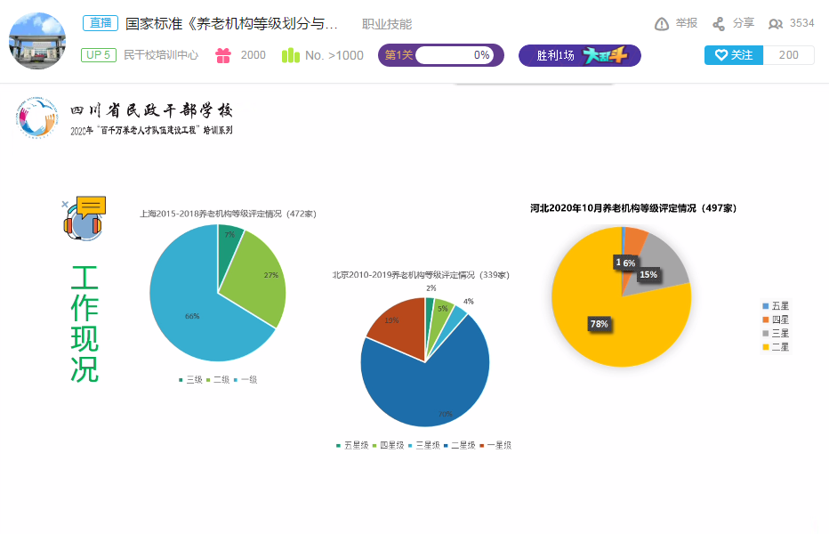 网课直播课程第一期的点击量达到3670人次,学员反响良好,取得了较圆满的效果。今年,全省“百千万养老人才队伍建设工程”网络直播培训系列计划还将陆续开展《高质量养老服务发展的要素保障分析》、《新冠肺炎疫情期间老人与职工心理压力疏导》、《养老机构营养膳食指导与管理》等三期养老专题的直播课程,利用线上课程覆盖面广、灵活度强的优势,从多元的角度提高养老从业人员的理论知识水平与实际工作效果。