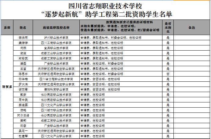 四川省志翔职业技术学校 “逐梦起新航”助学工程第二批资助学生名单公示