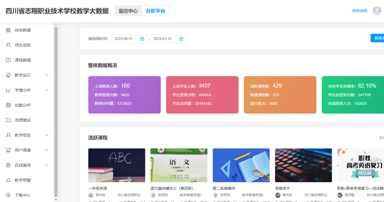 建设专业课程资源包6个。建成专业群管理平台、教学资源库和智慧教学系统,引入中职学校各学科教学资源包,优化了学校教育教学条件,推进了教学方法改革。2022年8月至今,共有2009班次使用,新建课程575门,160名教师上线,教师访问量121.3万次,3407名学生上线,学生访问量3319.4万次。
