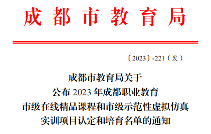 近日,成都市教育局公布了关于2023 年成都职业教育市级在线精品课程和市级示范性虚拟仿真实训项目认定和培育名单的通知,我校5门在线精品课程成功入选首批培育项目名单!在所有35个入选项目中我校占比达到七分之一。