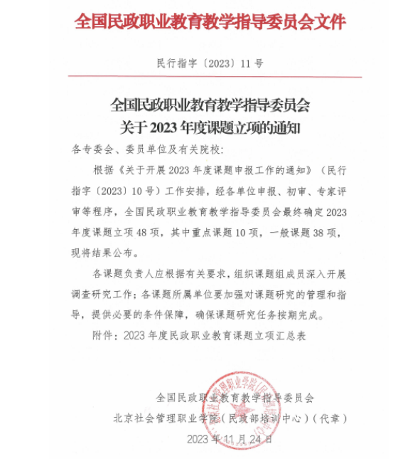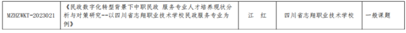 教师江红主持的课题《民政数字化转型背景下中职民政服务专业人才培养现状分析与对策研究—以四川省志翔职业技术学校民政服务专业为例》已通过全国民政职业教育教学指导员会评审,准予立项。