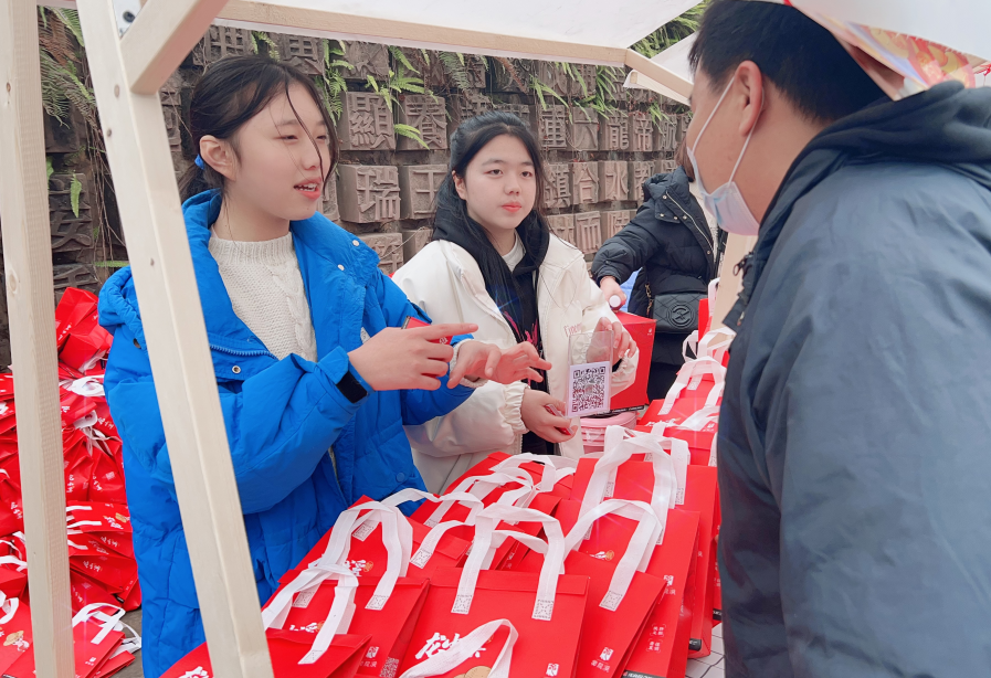 同学们分工明确,各司其职,满含热情地为游客们服务,真挚明媚的笑容、耐心细致的话语,为冬日的黄龙溪古镇增添了一抹亮色。