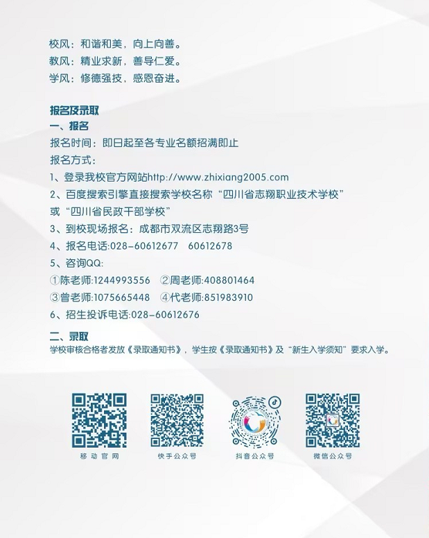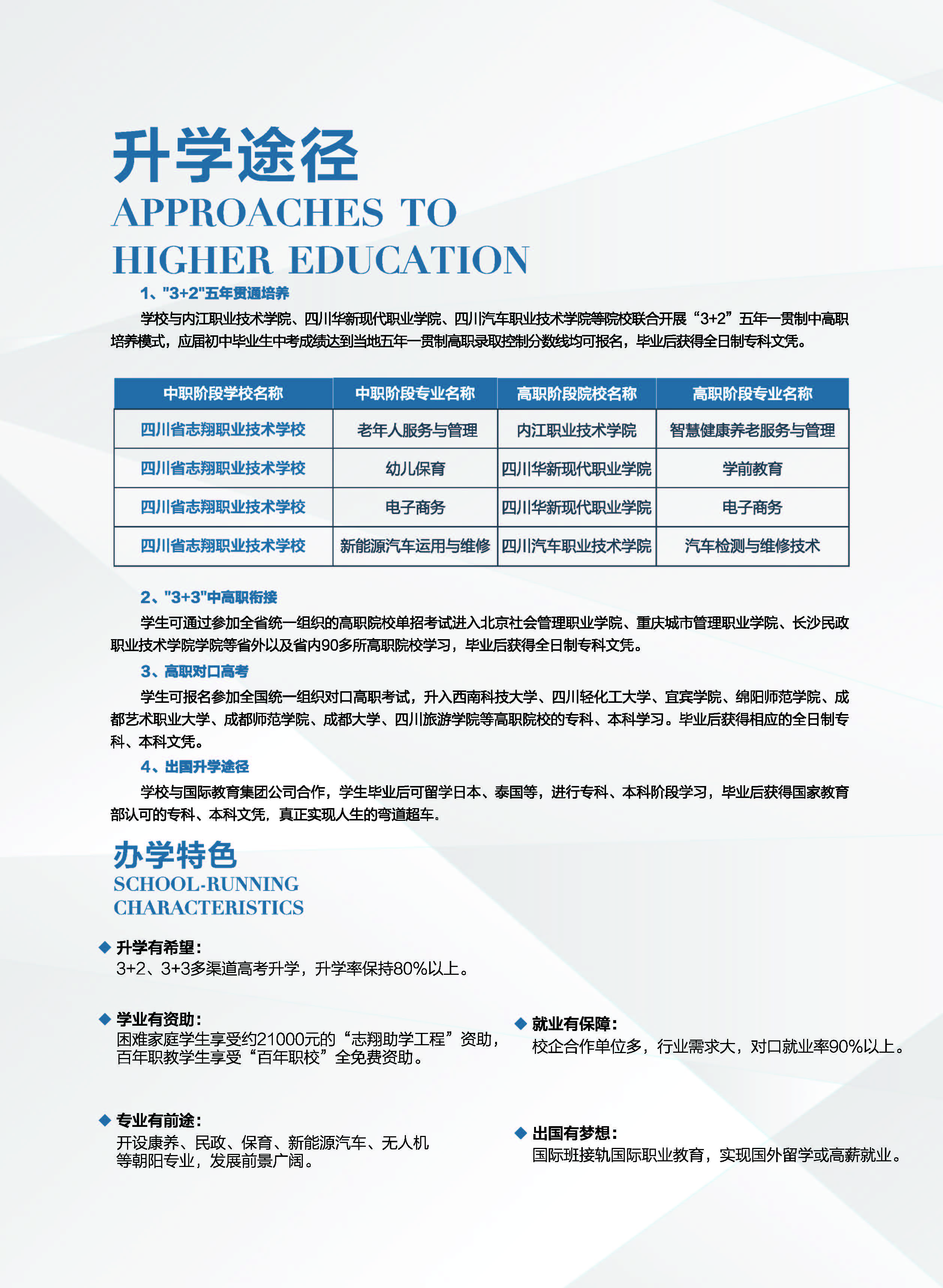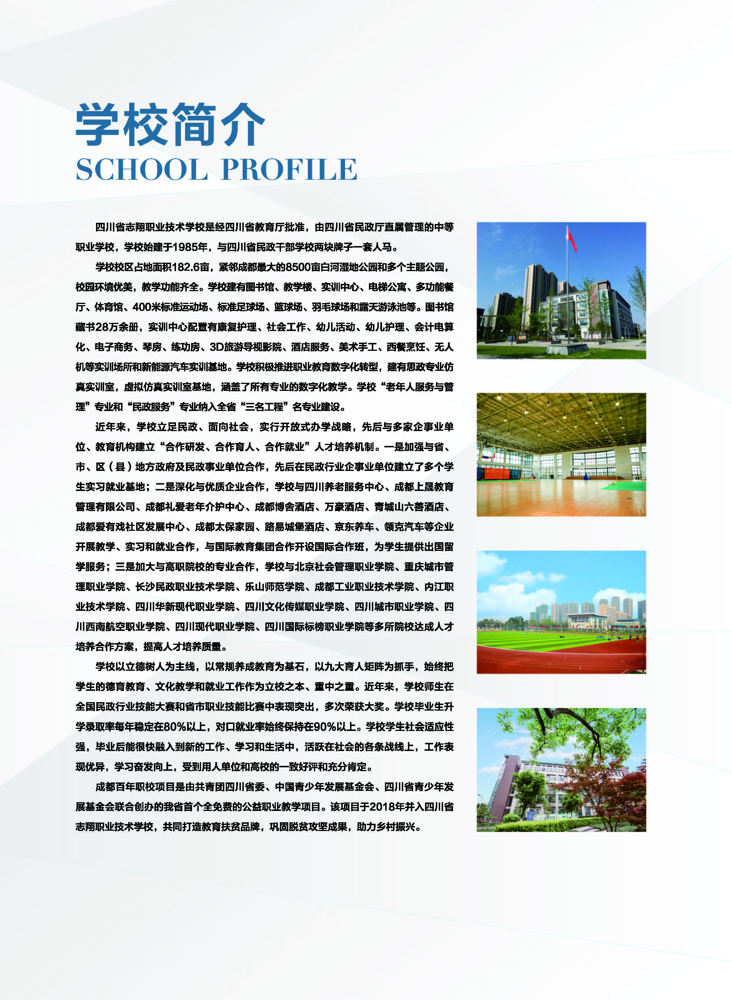 四川省志翔职业技术学校(四川省民政干部学校)是经四川省教育厅批准,由四川省民政厅直属管理的国家公办中等职业学校,学校于1986年建校。2008年,正式挂牌成立四川省志翔职业技术学校。